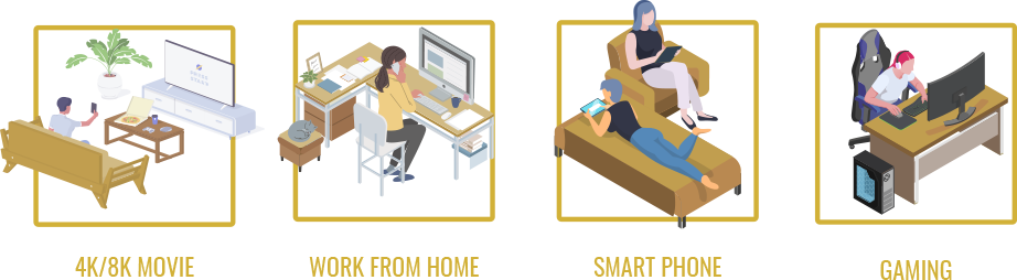 100インチのテレビで高画質4K映画や高速ゲーミングを楽しむ。スマート家電を取り入れた先進的な暮らしを楽しむ。スマホとPCの高性能化や、テレワーク、オンライン授業の普及に合わせ、家族全員が同時に高速WiFi接続ができるホームネットワークが今求められています。今の新しい生活スタイルを快適に過ごし、増え始めているスマート家電も安定的に接続し続けるには、パワフルな10G/マルチギガホームネットワークが必要です。