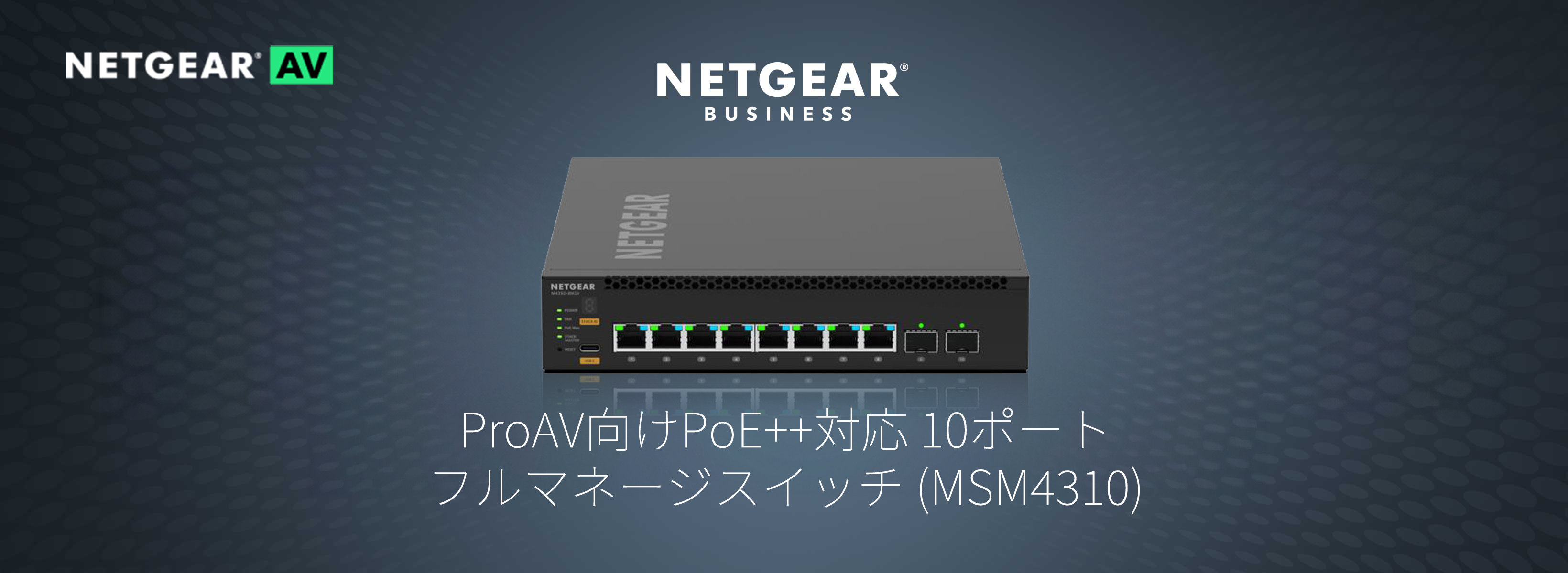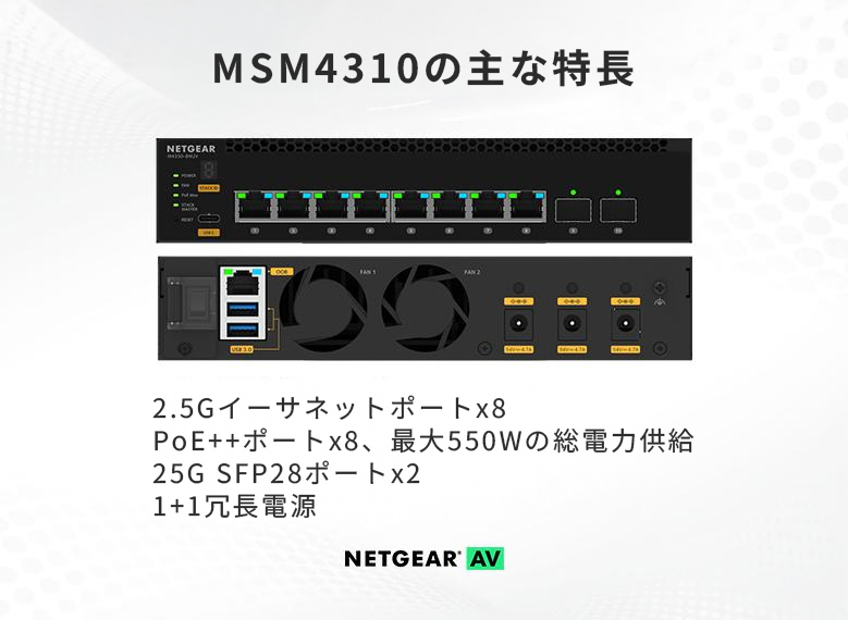 ProAV向けPoE++対応 2.5G (119W, 最大551W) x8ポート, 25G SFP28 x2スロット搭載フルマネージスイッチ【在庫以上のご注文の場合は、お問い合わせください】| MSM4310-100AJS| ¥668,525(税込) ProAV向け 24x1G/2.5G SFPおよび4x10Gコンボ/SFP+フルマネージスイッチ【在庫以上のご注文の場合は、お問い合わせください】| MSM4328F-100AJS| ¥912,340(税込) ProAV向けPoE++対応 24x2.5G、4x10G/マルチギガ、および4xSFP28 25G フルマネージスイッチ【在庫欠品中のため、発送日はご注文後にご連絡いたします】| MSM4332-100AJS| ¥983,125(税込) ProAV向け40x10G SFP+および4x100G QSFP28 マネージスイッチ搭載フルマネージスイッチ【在庫以上のご注文の場合は、お問い合わせください】| XSM4344FC-100AJS| ¥1,966,250(税込) MSM4310およびGSM4210PX用254W Powerアダプター【在庫欠品中のため、発送日はご注文後にご連絡いたします】| APS254W-10000S| ¥78,650(税込)