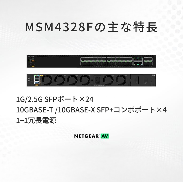 ProAV向けPoE++対応 2.5G (119W, 最大551W) x8ポート, 25G SFP28 x2スロット搭載フルマネージスイッチ【在庫以上のご注文の場合は、お問い合わせください】| MSM4310-100AJS| ¥668,525(税込) ProAV向け 24x1G/2.5G SFPおよび4x10Gコンボ/SFP+フルマネージスイッチ【在庫以上のご注文の場合は、お問い合わせください】| MSM4328F-100AJS| ¥912,340(税込) ProAV向けPoE++対応 24x2.5G、4x10G/マルチギガ、および4xSFP28 25G フルマネージスイッチ【在庫欠品中のため、発送日はご注文後にご連絡いたします】| MSM4332-100AJS| ¥983,125(税込) ProAV向け40x10G SFP+および4x100G QSFP28 マネージスイッチ搭載フルマネージスイッチ【在庫以上のご注文の場合は、お問い合わせください】| XSM4344FC-100AJS| ¥1,966,250(税込) MSM4310およびGSM4210PX用254W Powerアダプター【在庫欠品中のため、発送日はご注文後にご連絡いたします】| APS254W-10000S| ¥78,650(税込)